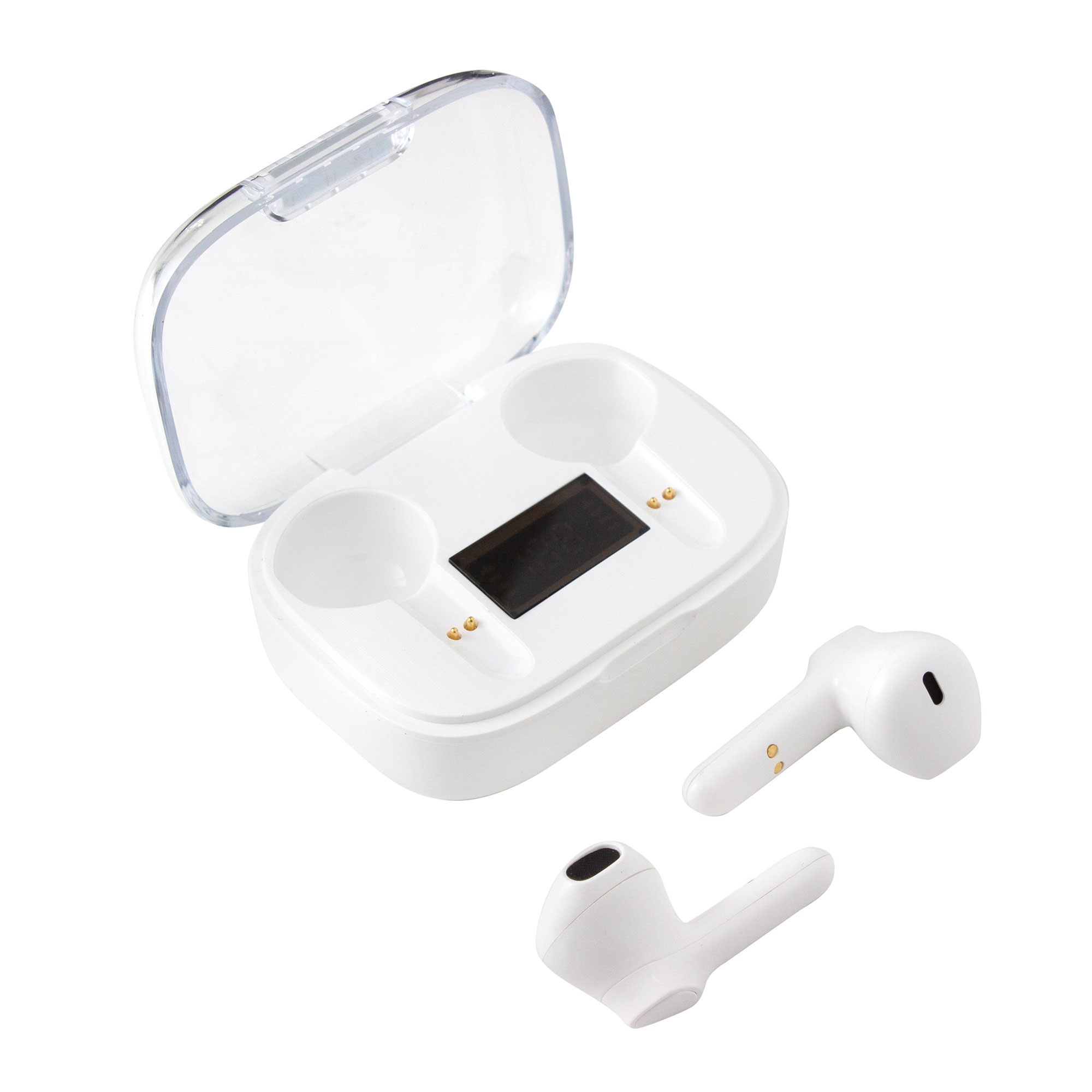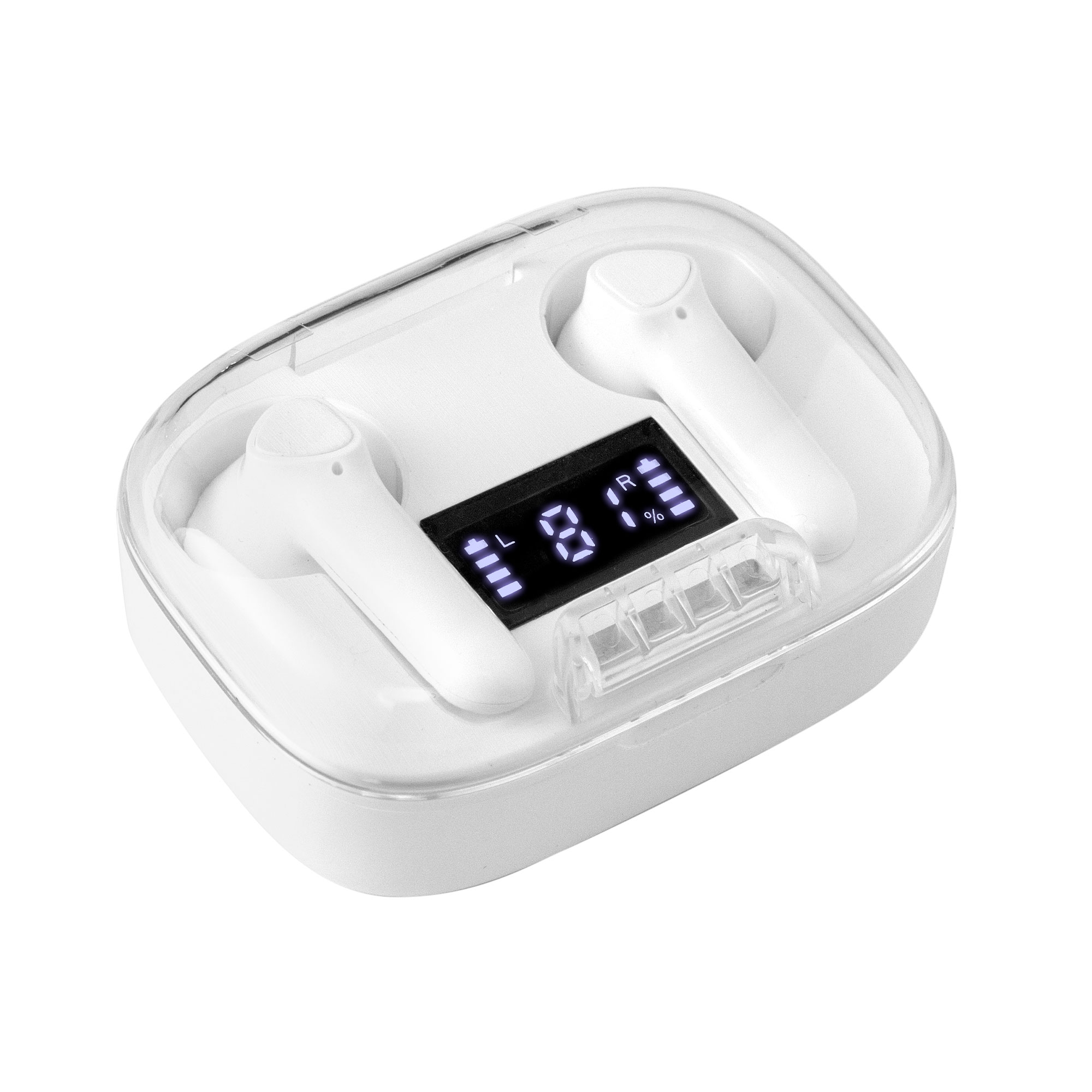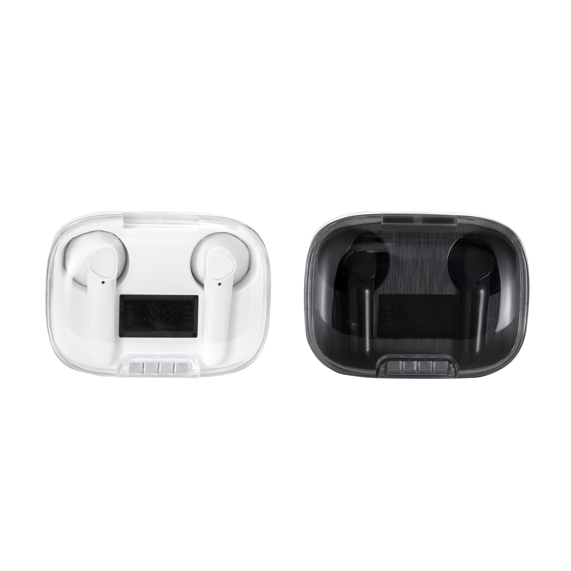 Sonido nítido, sin cablesAuriculares Bluethooth. Pantalla digital y tapa transparente. Rango de alcance: 15 metros. Tiempo de reproducción: aprox. 3 horas. Tiempo de Carga: 1 hora Duración de la carga en inactividad: 200 horas. Cable de carga USB tipo C en color blanco para auriculares blancos, y en color negro para la versión en negro. Medidas: 6 x 4,5 x 2,5 mm.