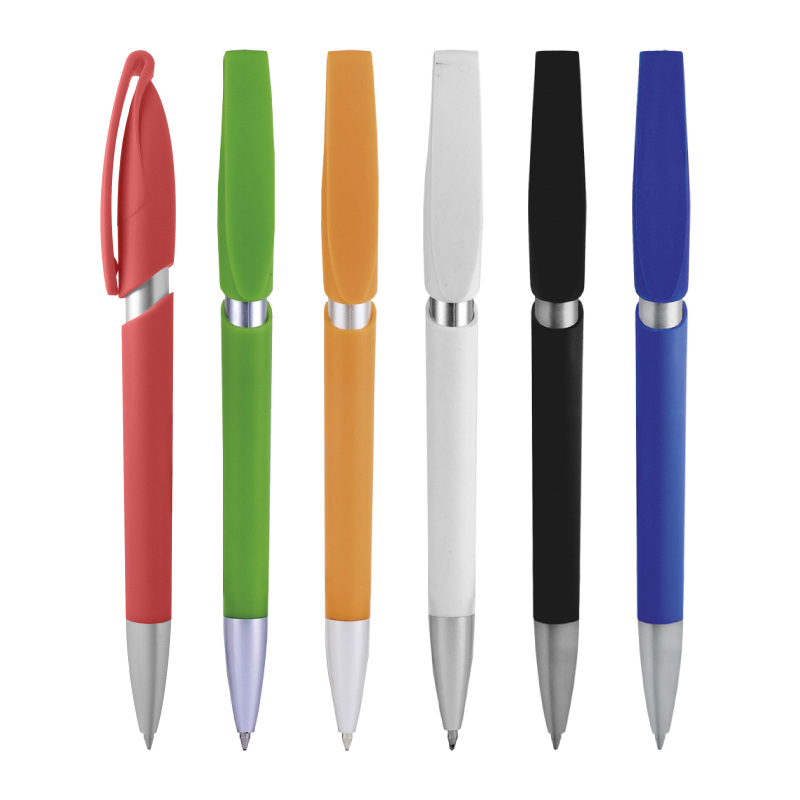 Plástico. Apertura retráctil con pulsador. Clip plástico, color plata en punta y cuerpo. Tinta negra.