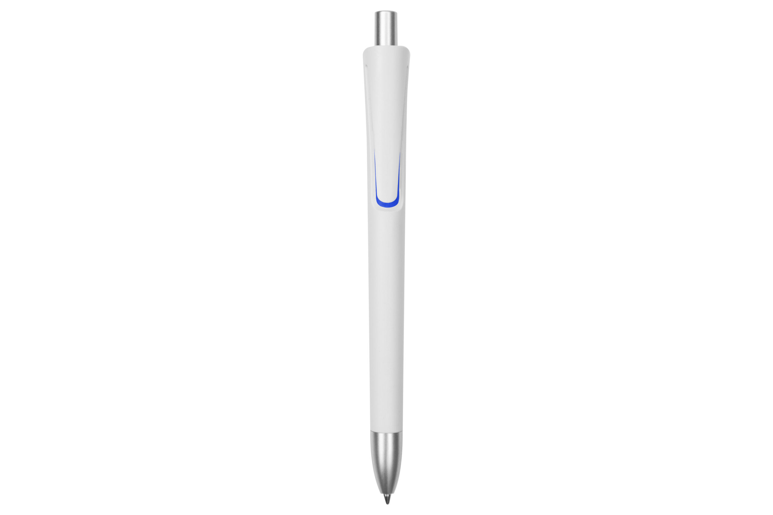 Plástico. Cuerpo blanco mate. Clip, punta y pulsador color plata. Debajo del clip detalle de color. Tinta azul.