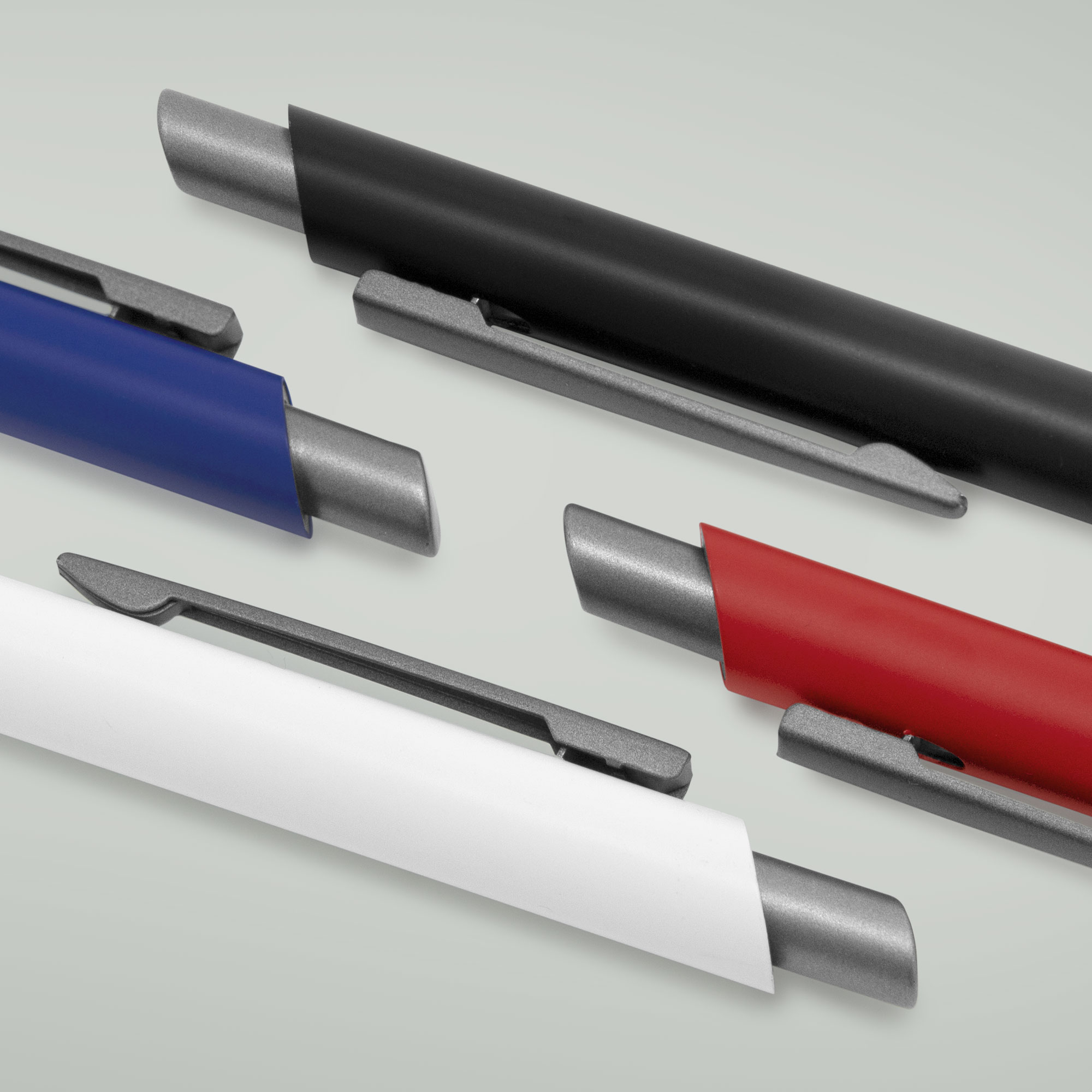 Aluminio, ABS, Acero. Boligrafo retráctil. Cuerpo revestido en laca de diferentes colores. Acabado mate. Pulsador, clip y puntera de color gris gun m…