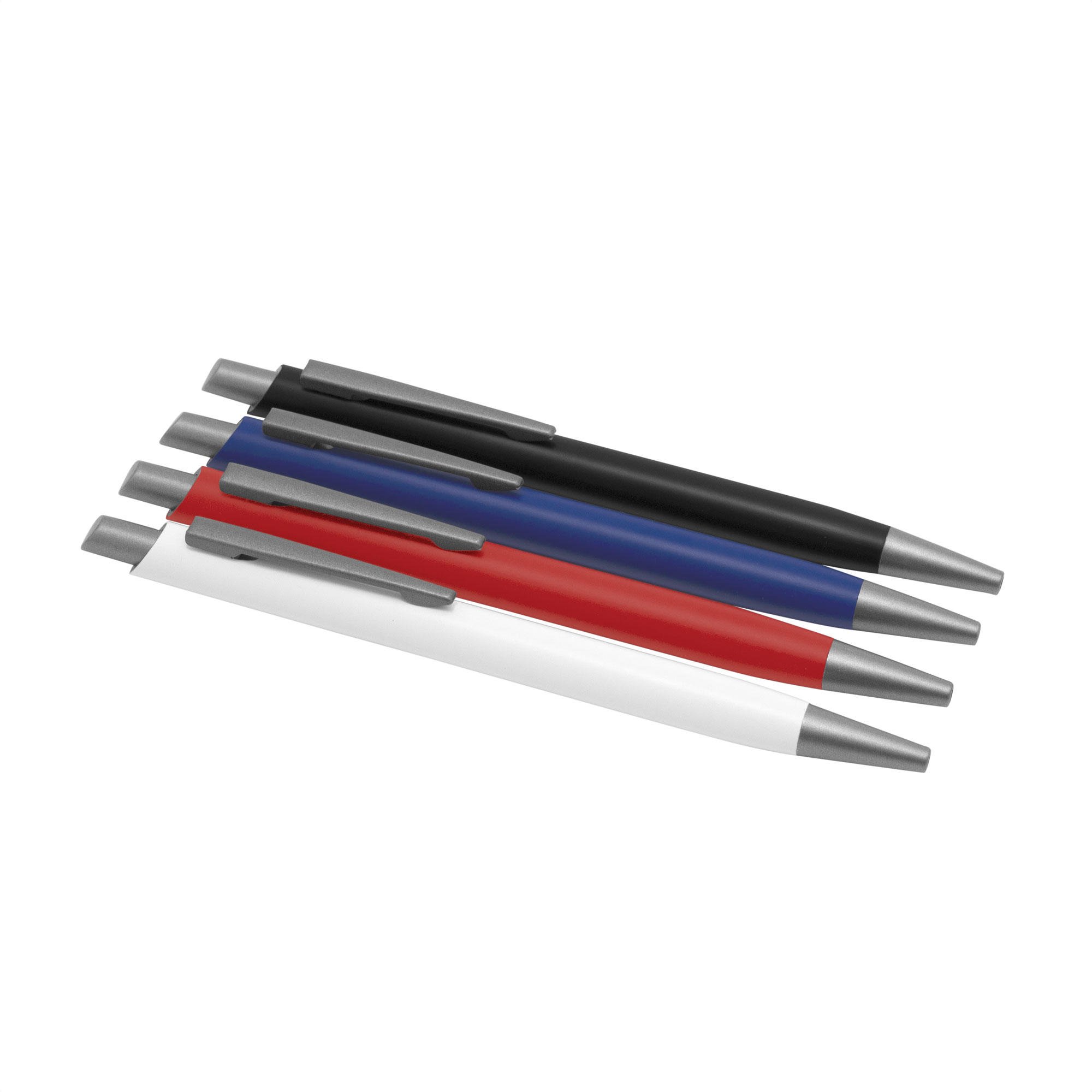 Aluminio, ABS, Acero. Boligrafo retráctil. Cuerpo revestido en laca de diferentes colores. Acabado mate. Pulsador, clip y puntera de color gris gun metal. Tinta azul. Amplia área de impresión.