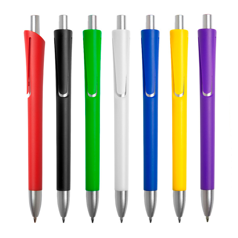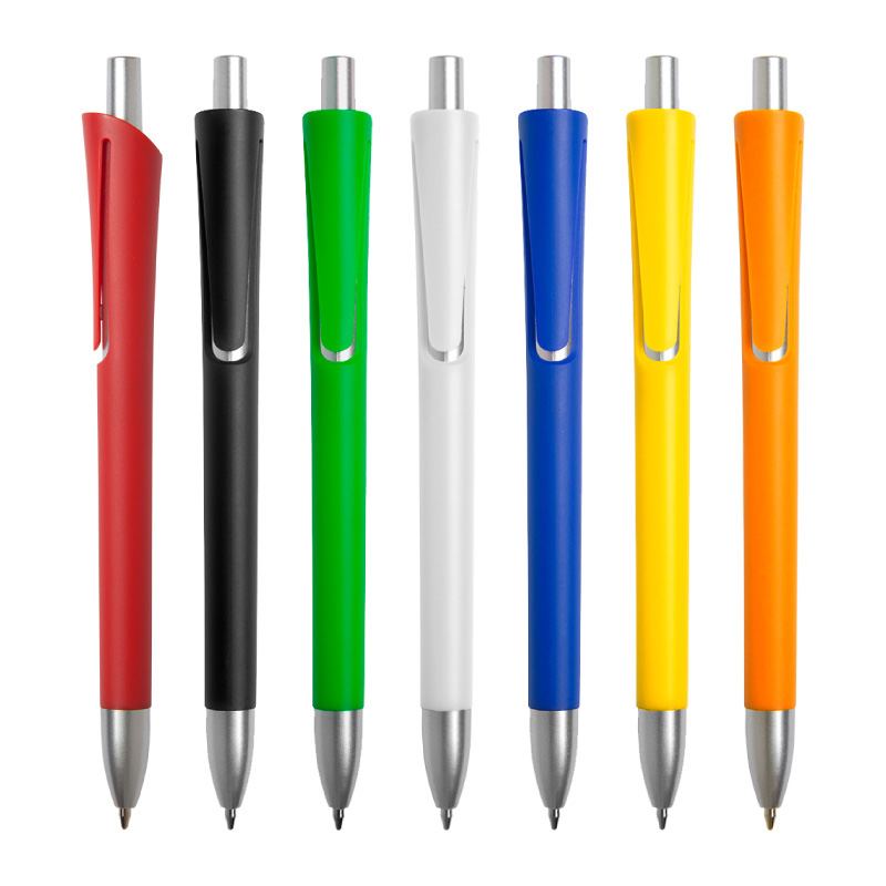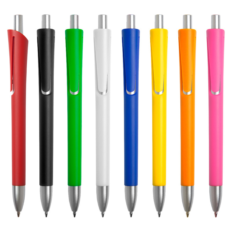 Plástico. Bolígrafo con cuerpo plástico de color, botón pulsador y puntera color plata. Tinta negra