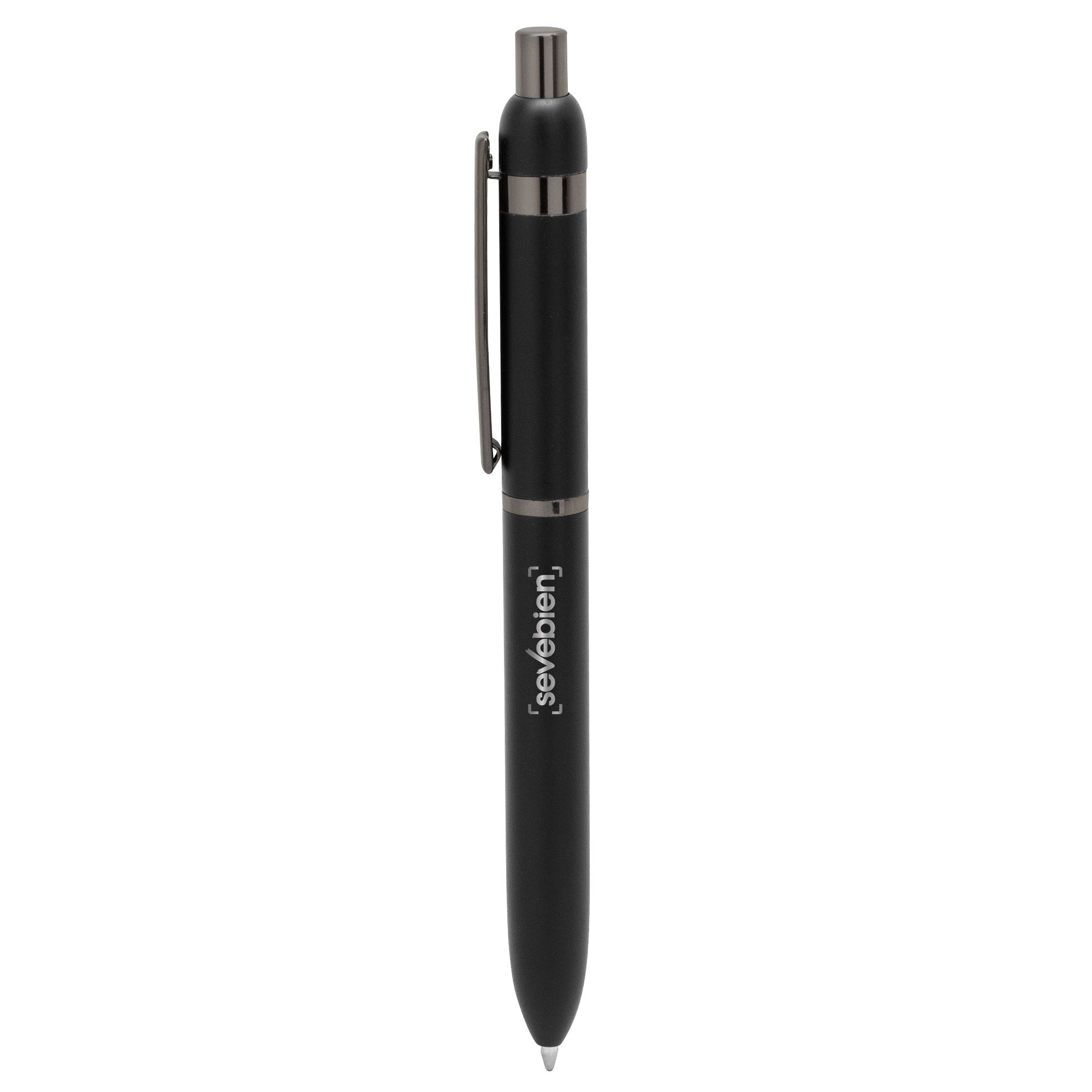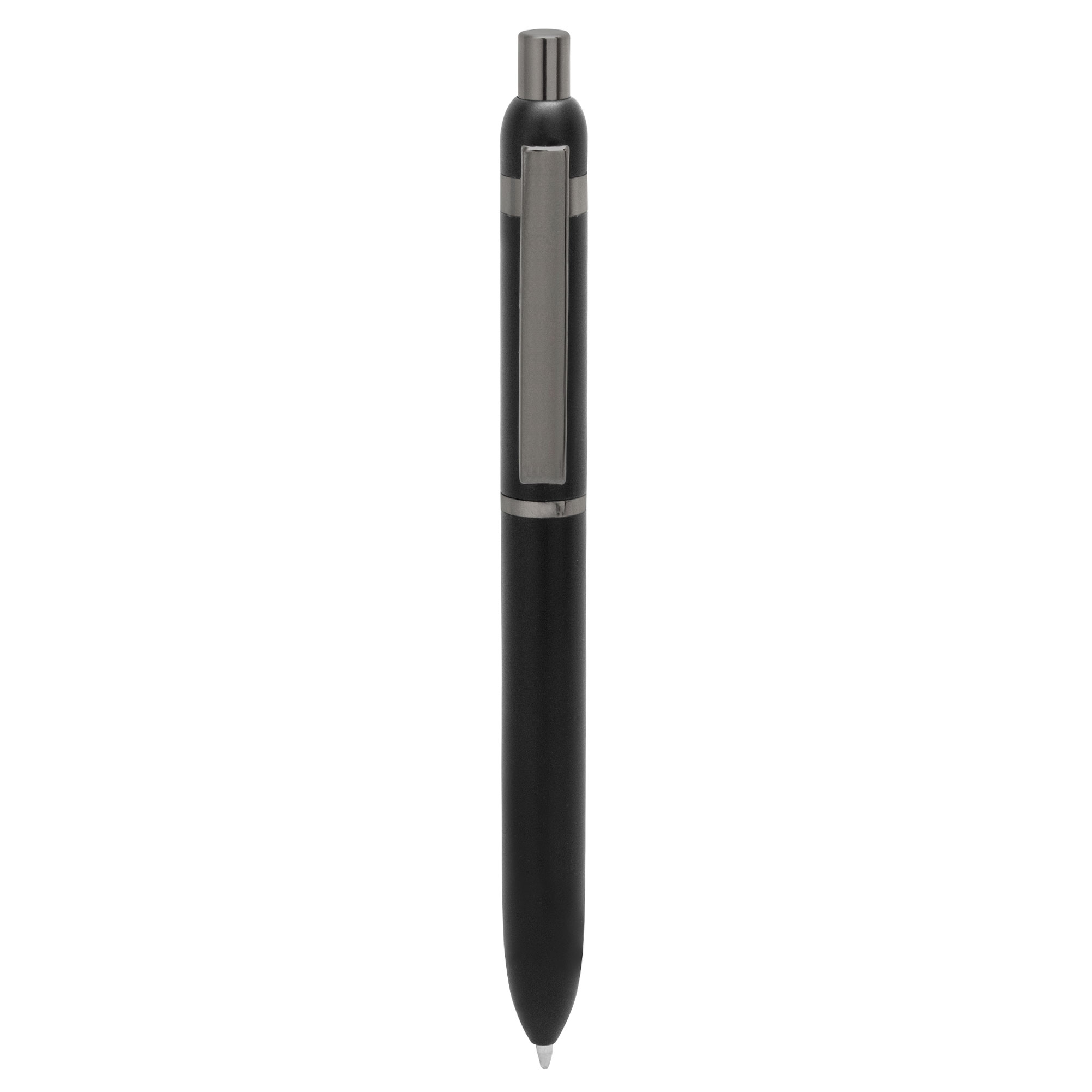 Metal. Cuerpo de aluminio. Bolígrafo retráctil. Clip, botón y anillos metálicos color plata. Tinta Azul. Destape electroplateado en ambas partes…..