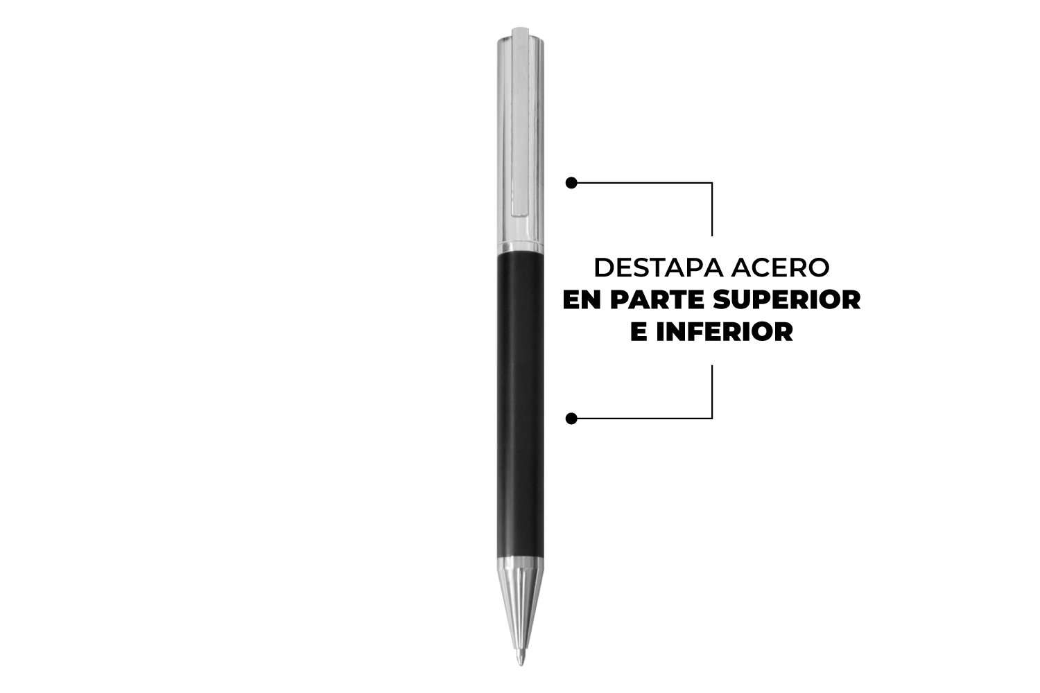 Metálico. Bolígrafo con apertura giratoria. Destape acero en la parte superior e inferior. Cuerpo color negro. Clip, tambor superior y puntera col…
