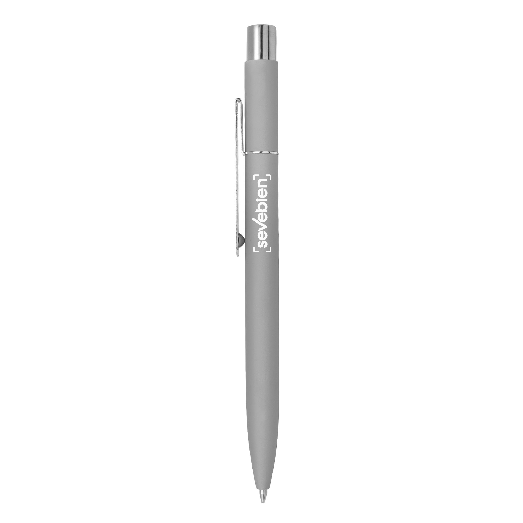 Metal. Cuerpo de aluminio, acabado engomado en diferentes colores, muy suave al tacto. Bolígrafo retráctil. Clip, pulsador y anillo metálicos color plata. Tinta negra. Destape al grabar color plata.
