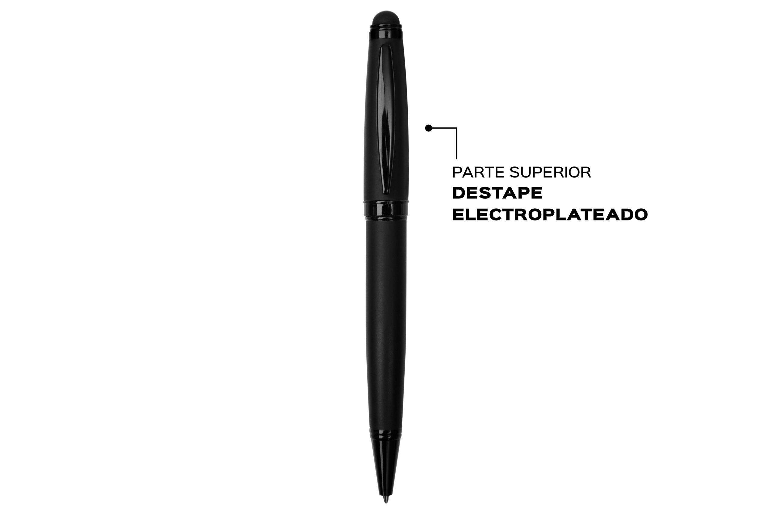 Metal. Cuerpo metálico negro mate. Clip y puntera metálicos negro brillo. Bolígrafo con puntera touch. Apertura giratoria. Tinta azul. Destape electroplateado en la parte superior. Presentación en caja de regalo.