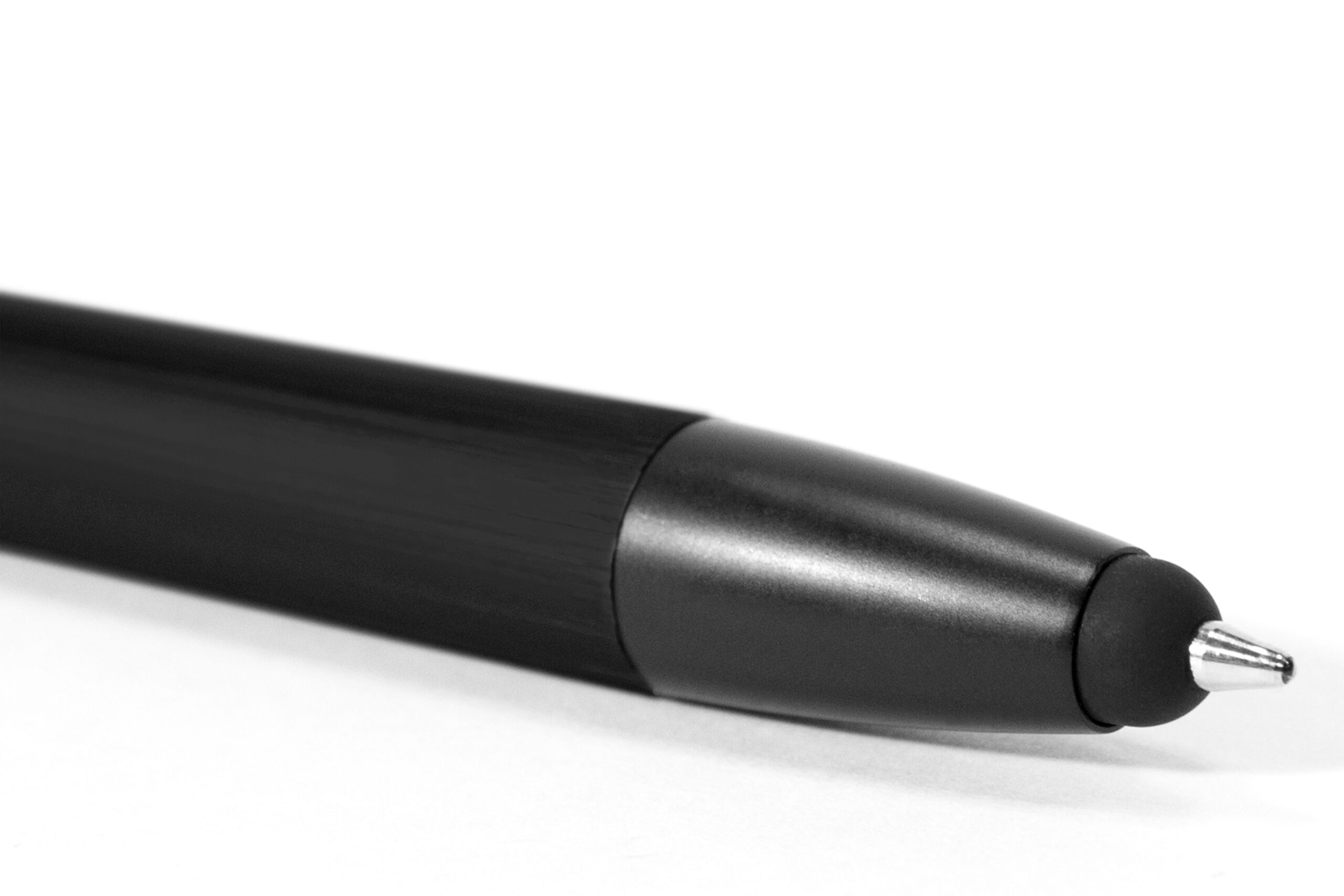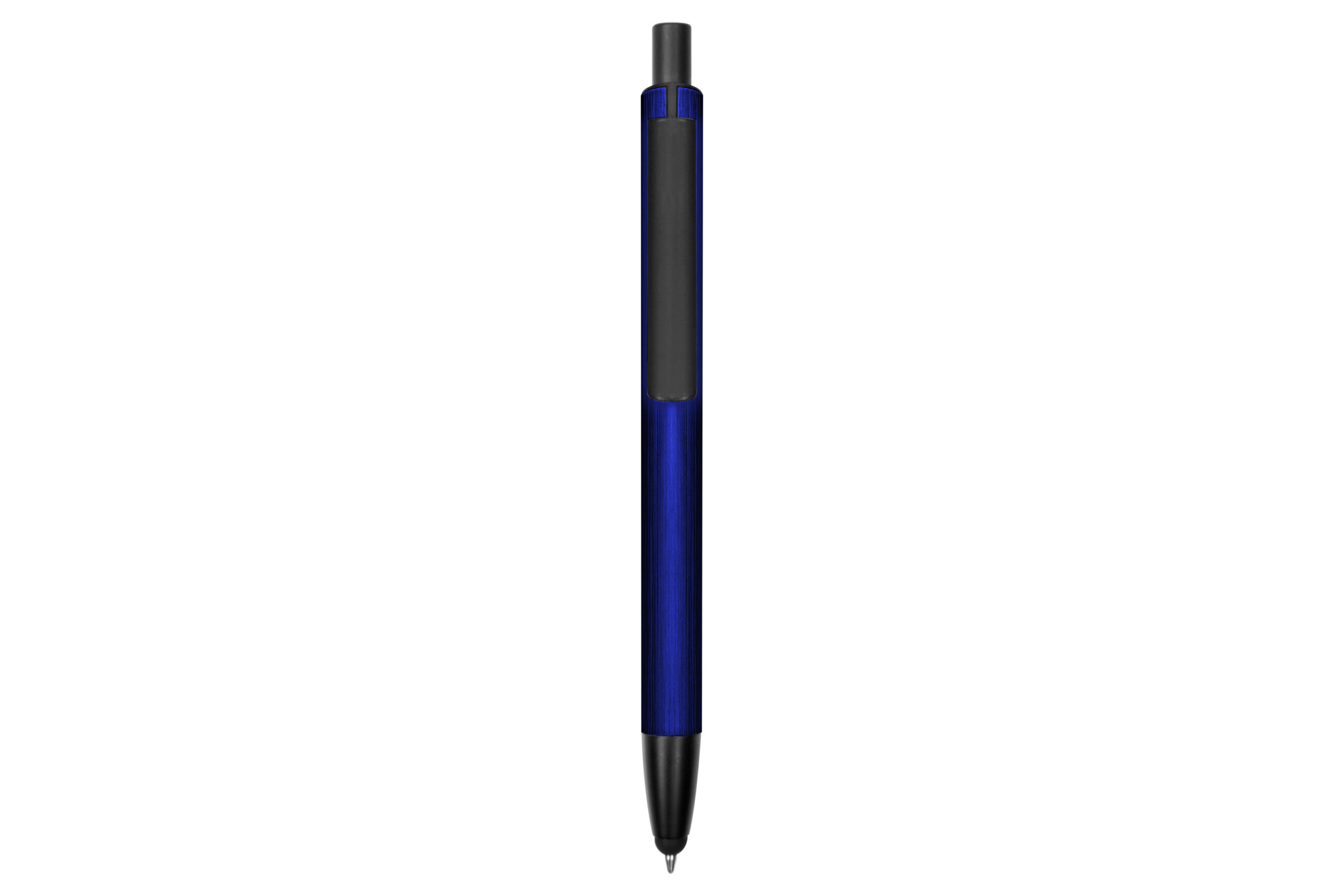 Aluminio. Cuerpo metálico. Clip, punta y pulsador plásticos. Punta touch. Tinta azul.
