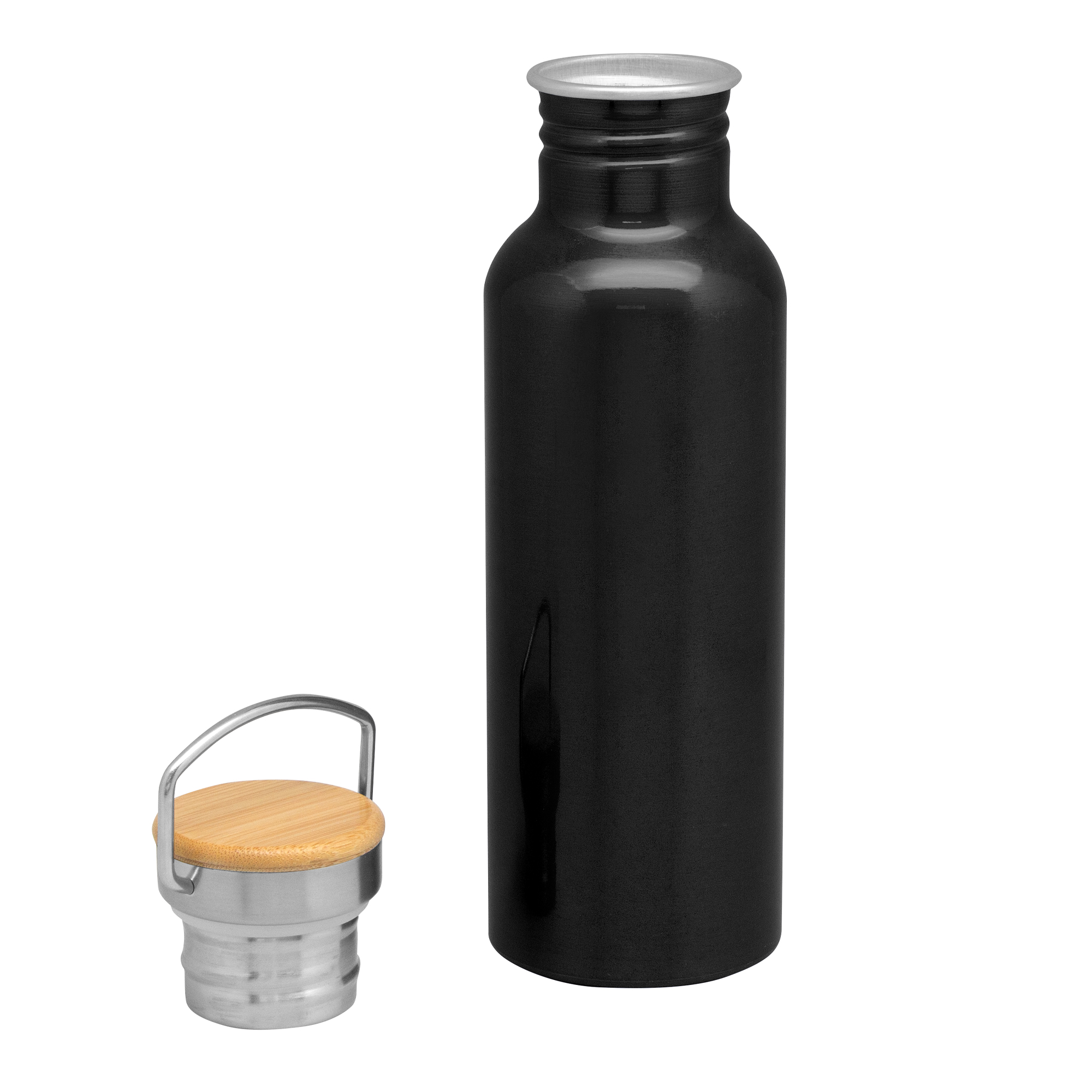 Ø 7,3 x 24 cm. Capacidad 750 ml. Aluminio. Tapa de acero con manija metálica rebatible y detalles en bambú. Anillo de silicona antiderrame. Presentación en caja de regalo Kraft