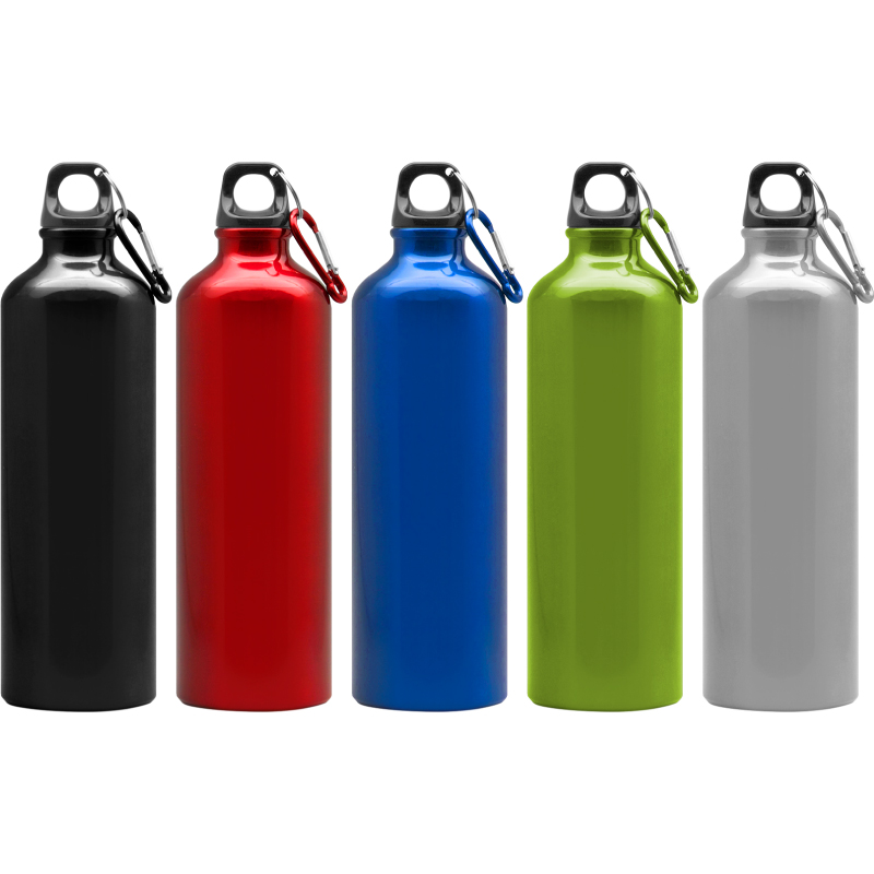 Ø 7,2 x 25,5 cm. Capacidad 750 ml. Aluminio. Botella de aluminio. Tapa a rosca plástica y gancho metálico.