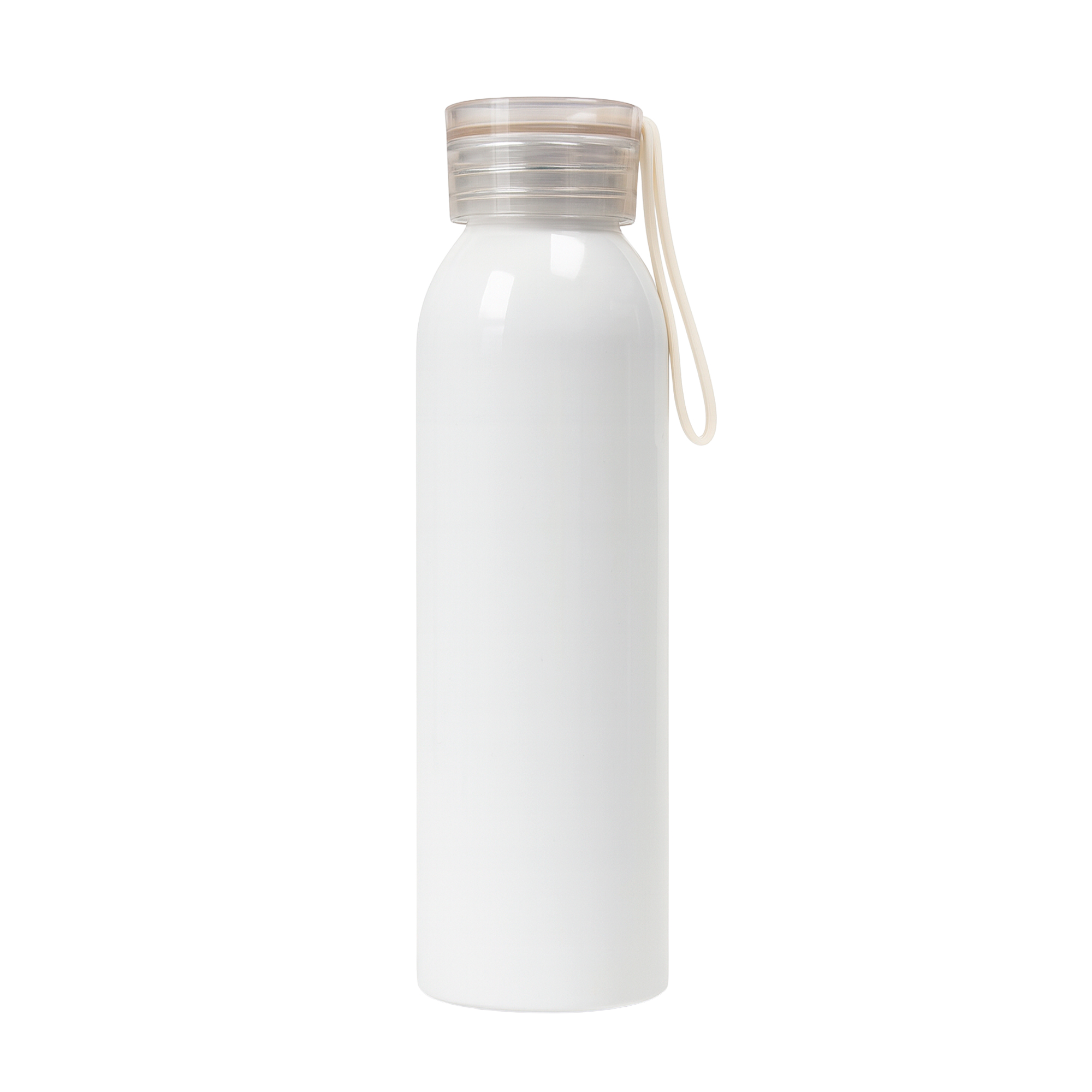Hidratate con clase.Botella de aluminio, cuerpo color blanco y tapa plástica translúcida con tira de silicona del mismo color de 8 cm de largo. Med…