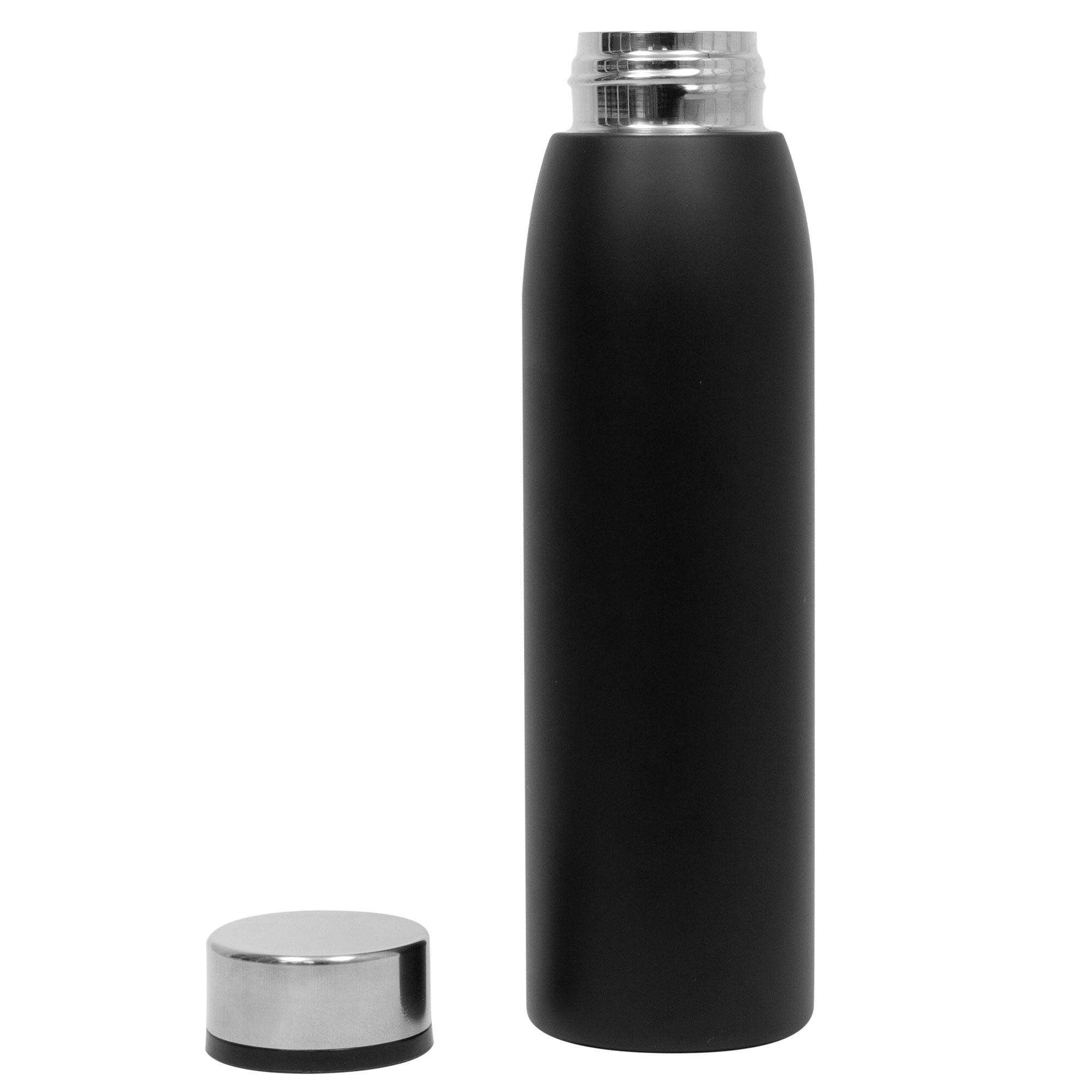 Ø 7 x 26 cm. Capacidad 750 ml. Botella doble pared, sellada al vacío. Interior de acero 304 y exterior de acero 201. Cuerpo color negro y tapa a rosca de acero. Mantiene hasta 12 hs la temperatura de las bebidas calientes y 24 hs de las bebidas frías. Presentación en caja de regalo.