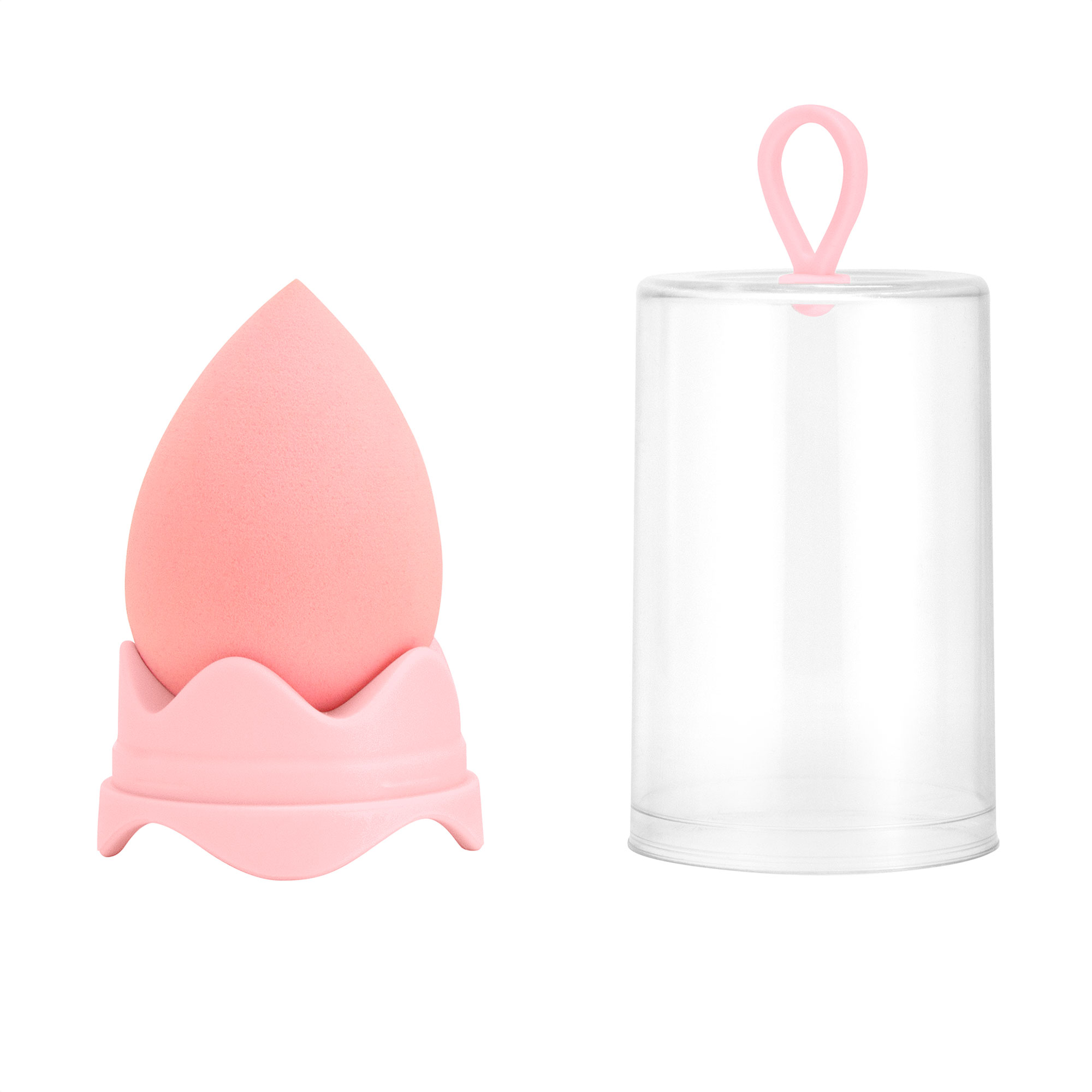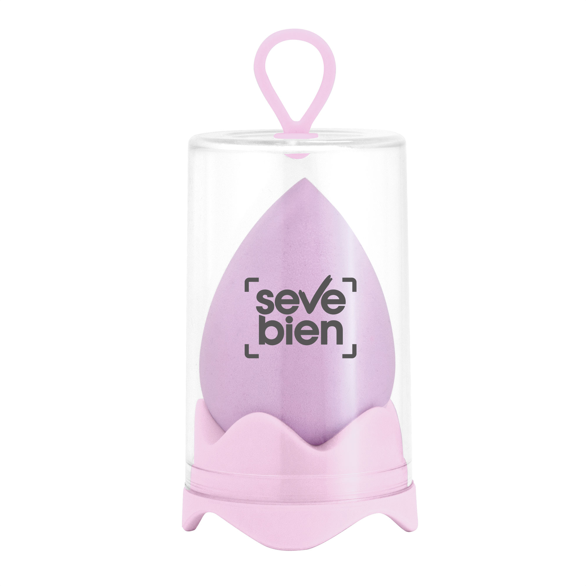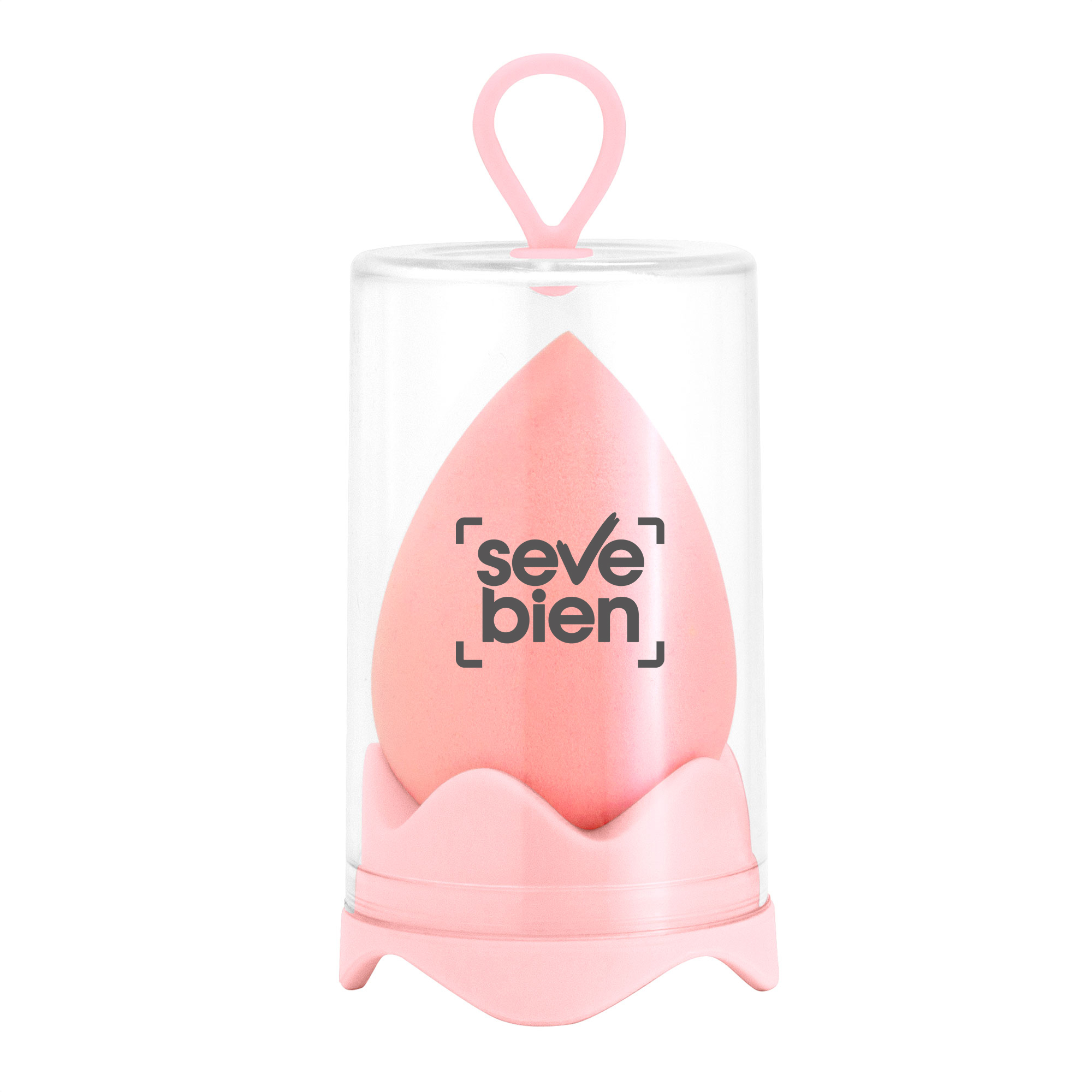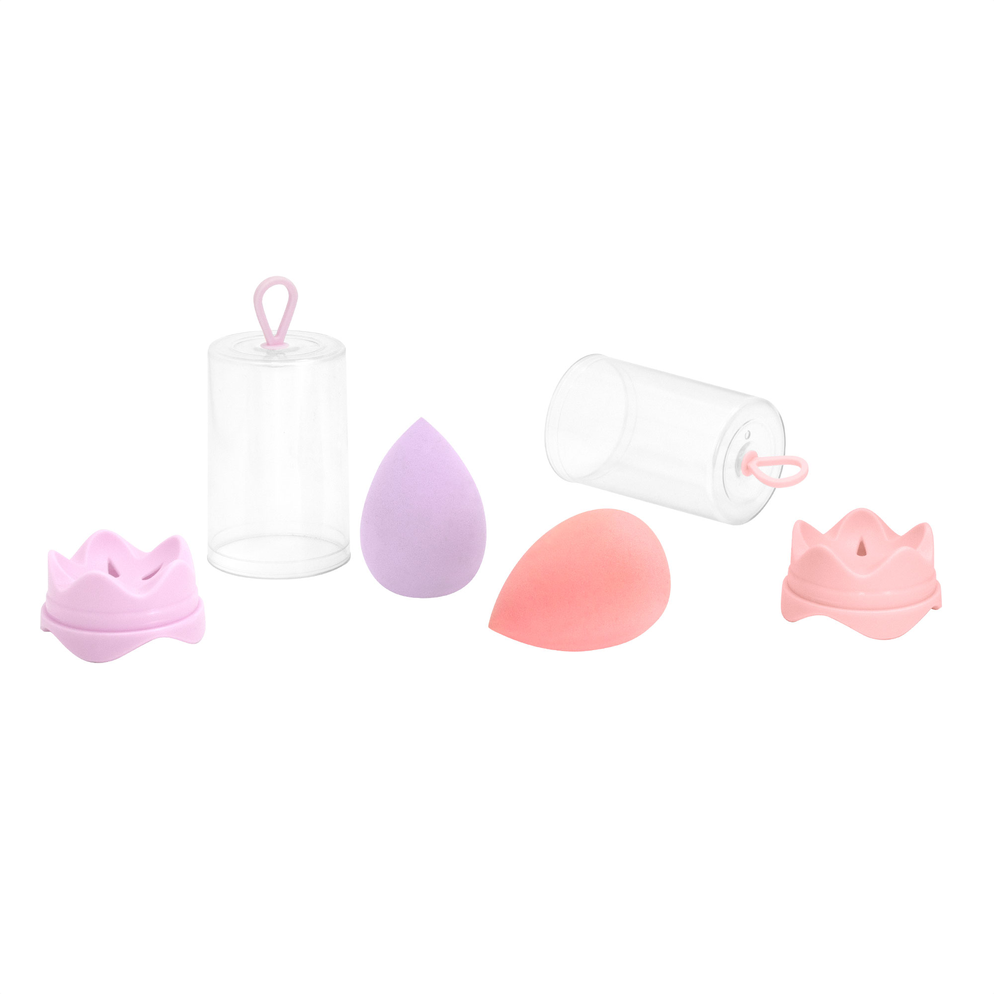 6 x 4 x 4 cm. Esponja PP. Esponja de maquillaje. Estuche de plástico transparente (Ø 4,5 x 8,5 cm.) con gancho y base del mismo color que la esponja