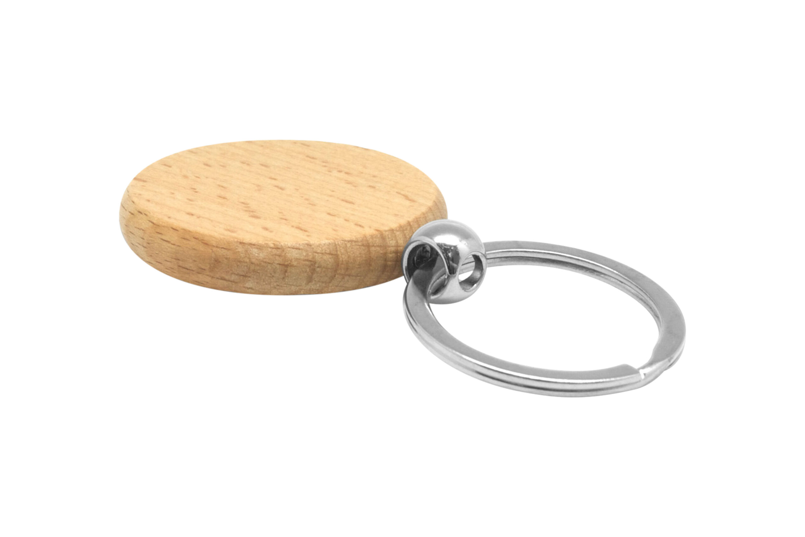 Ø 3,1 x 0,5 cm. (La medida no incluye el aro). Madera. Llavero redondo con aro metálico.
