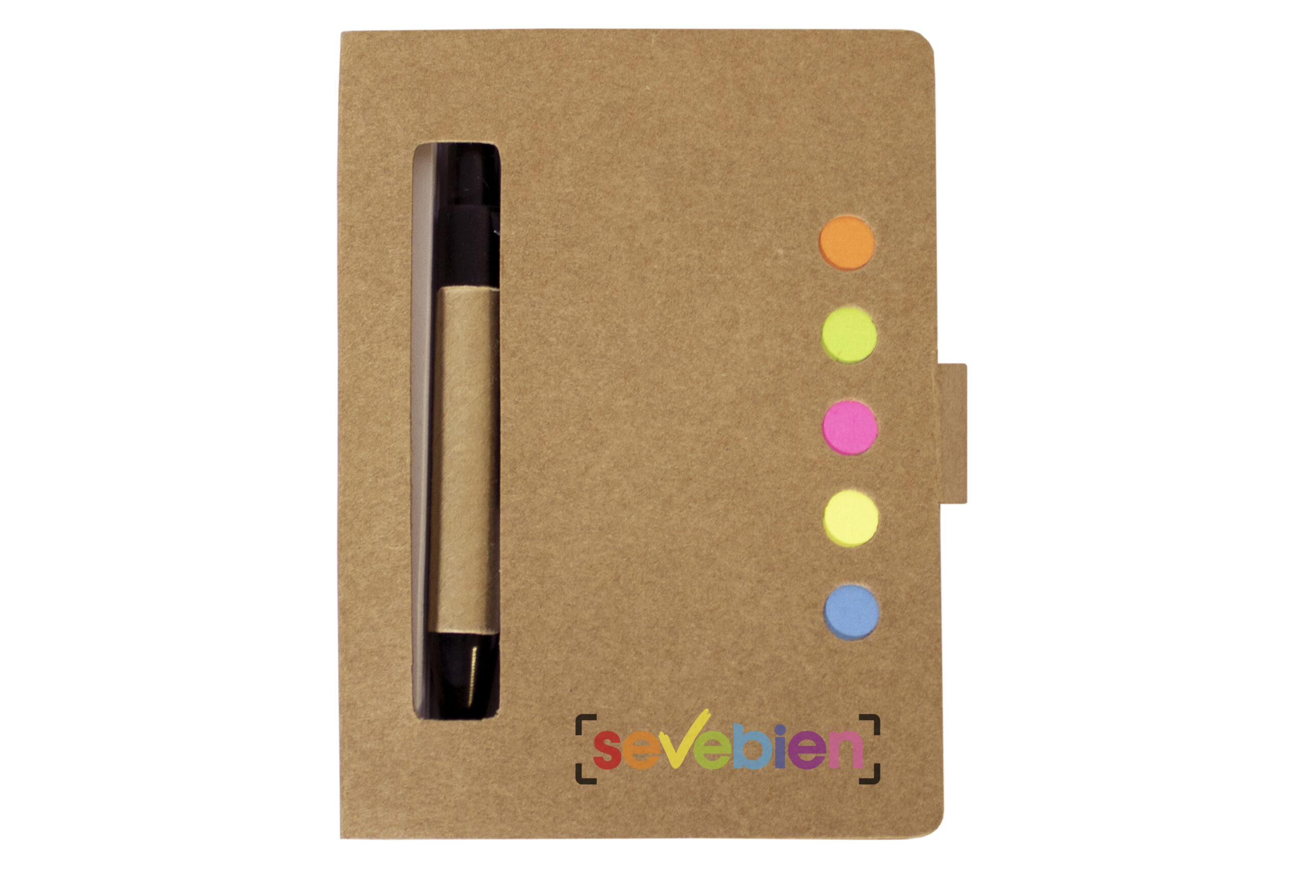 10,5 x 7,8 x 1,1 cm. Cartón. Material reciclado. 80 hojas lisas blancas. 5 blocs autoadhesivos rectangulares de diferentes colores. 1 bolígrafo de tinta negra.
