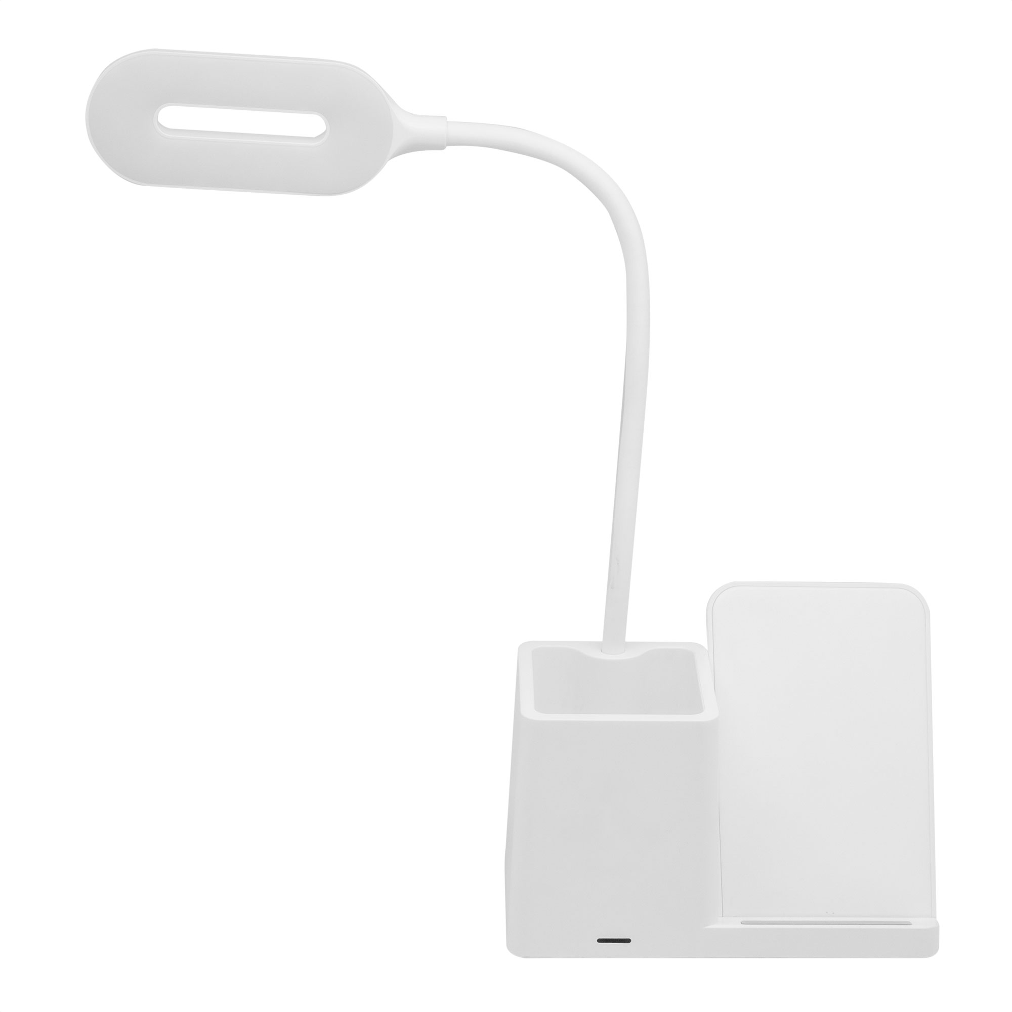 Ilumina y organizaLámpara de escritorio con portabolígrafos y cargador inalámbrico para teléfono móvil. Posee 3 modos de luz: cálida, fría y tenue. Cuello flexible. Carga rápida inalámbrica de 15w. Conector tipo USB-C.
