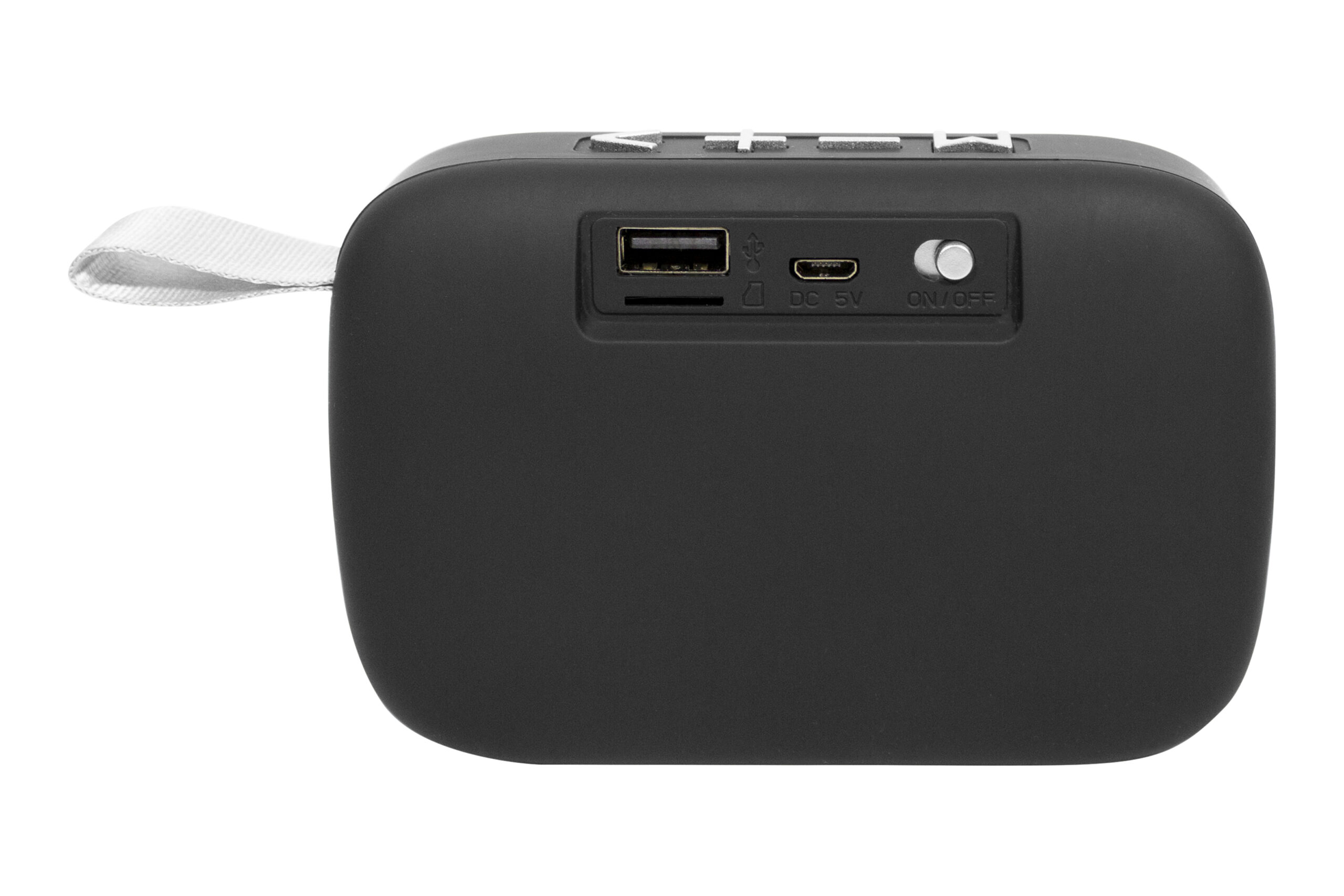 12 x 7,5 x 3,5 cm. Plástico engomado (ABS +FABRIC) . Parlante Bluetooth. La luz azul parpadeará alternativamente hasta que el emparejamiento haya sido exitoso. Cuenta con botones en la parte superior del parlante : Botón (M) modo que permite seleccionar TF card, bluetooth/USB. Botón (-) permite seleccionar canciones anteriores o bajar el volumen. Botón (+) permite pasar a la siguiente canción o subir el volumen. Botón (>) funciona como play/pausa y tomar una llamada. En la parte posterior, el parlante posee conexión mini usb y botón de on/off. Cable de carga con longitud de 50 cm. Presentación en caja de regalo.