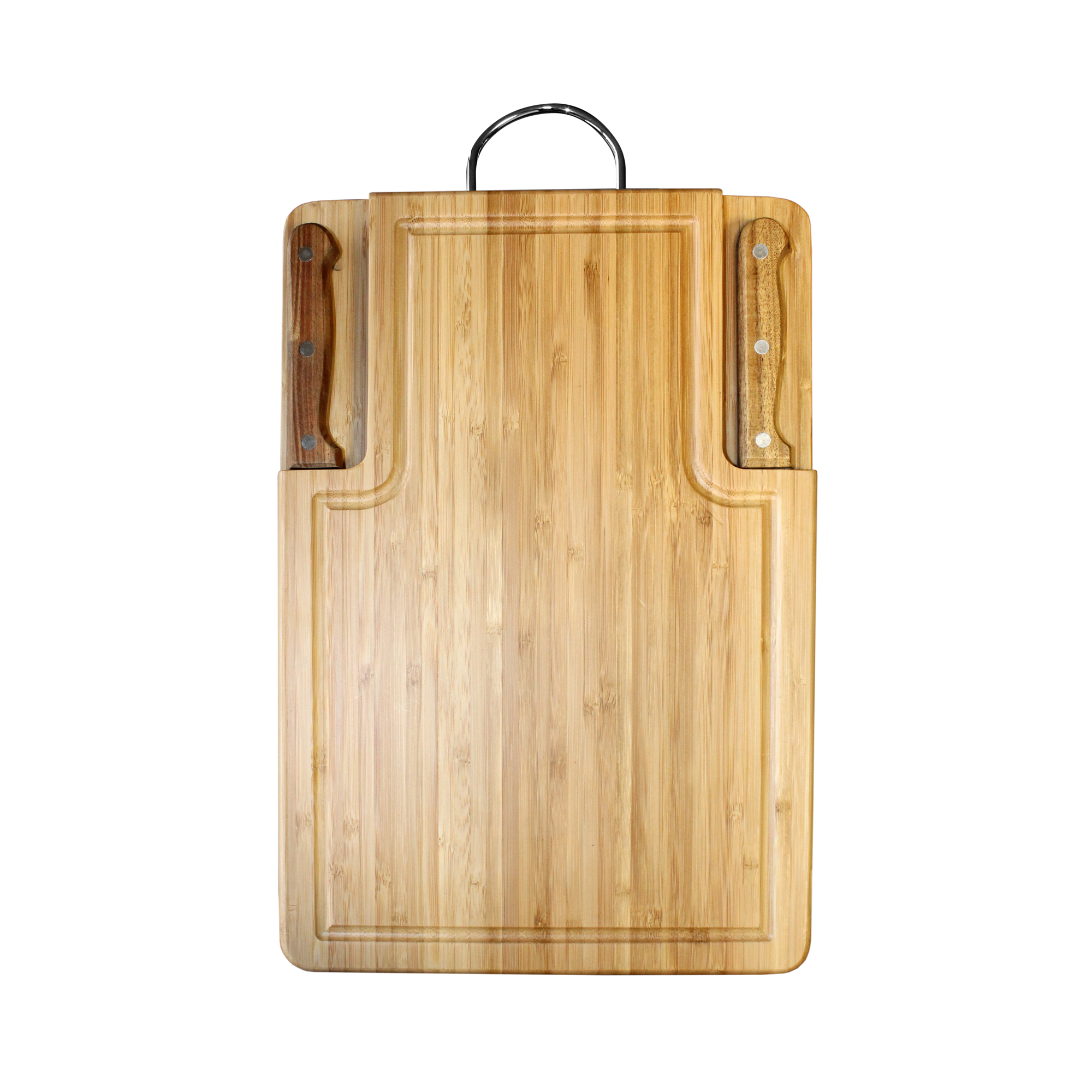 38 x 25 x 2,5 cm. Bambú. Set parrillero con tabla con manija de metal, cuchilla de 20 x 2,5 y tenedor asador de 18,5 cm con mangos de madera.Presentación en caja de regalo.
