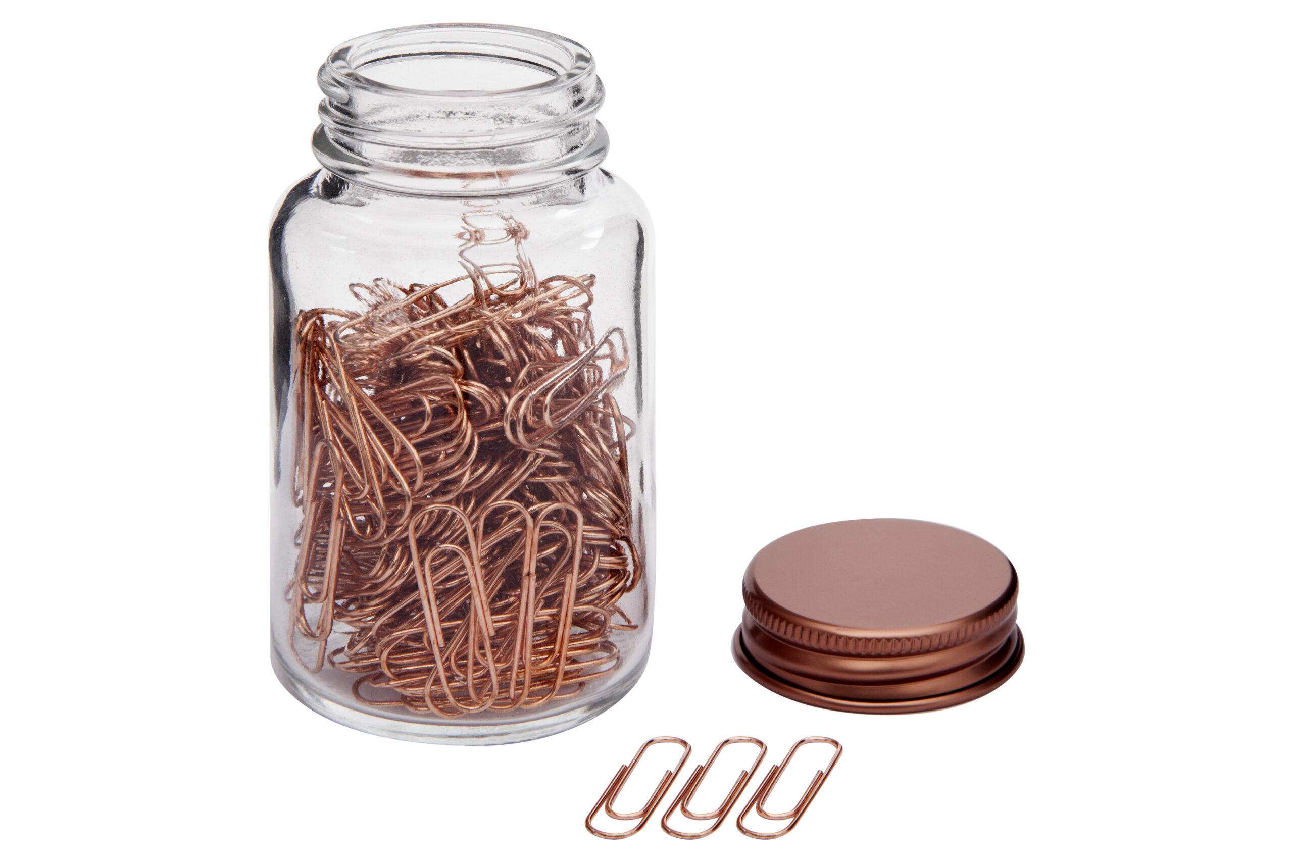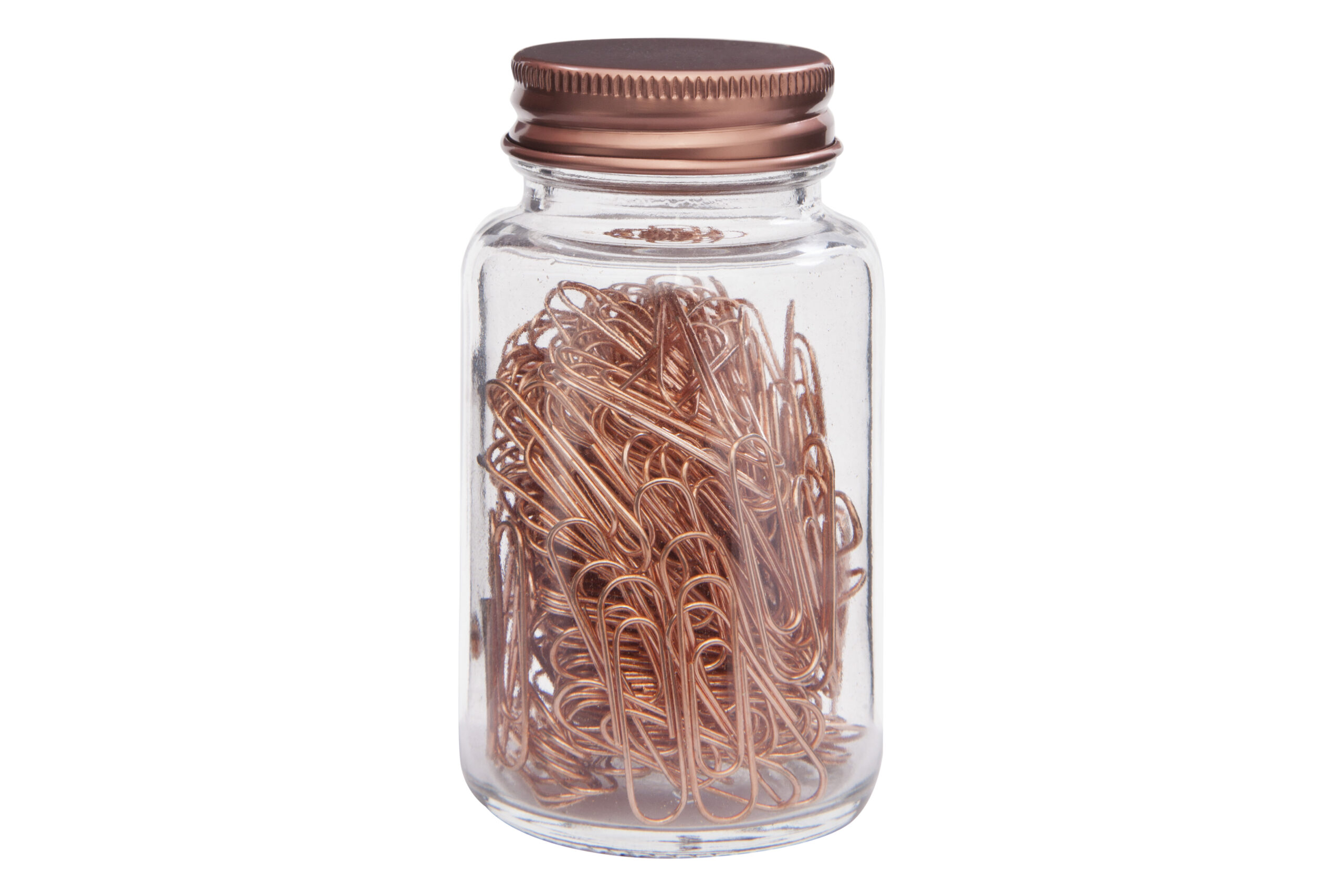Ø 4,5 x 8,5 cm. Vidrio y metal. Set de clips metálicos en frasco de vidrio con tapa metálica.
