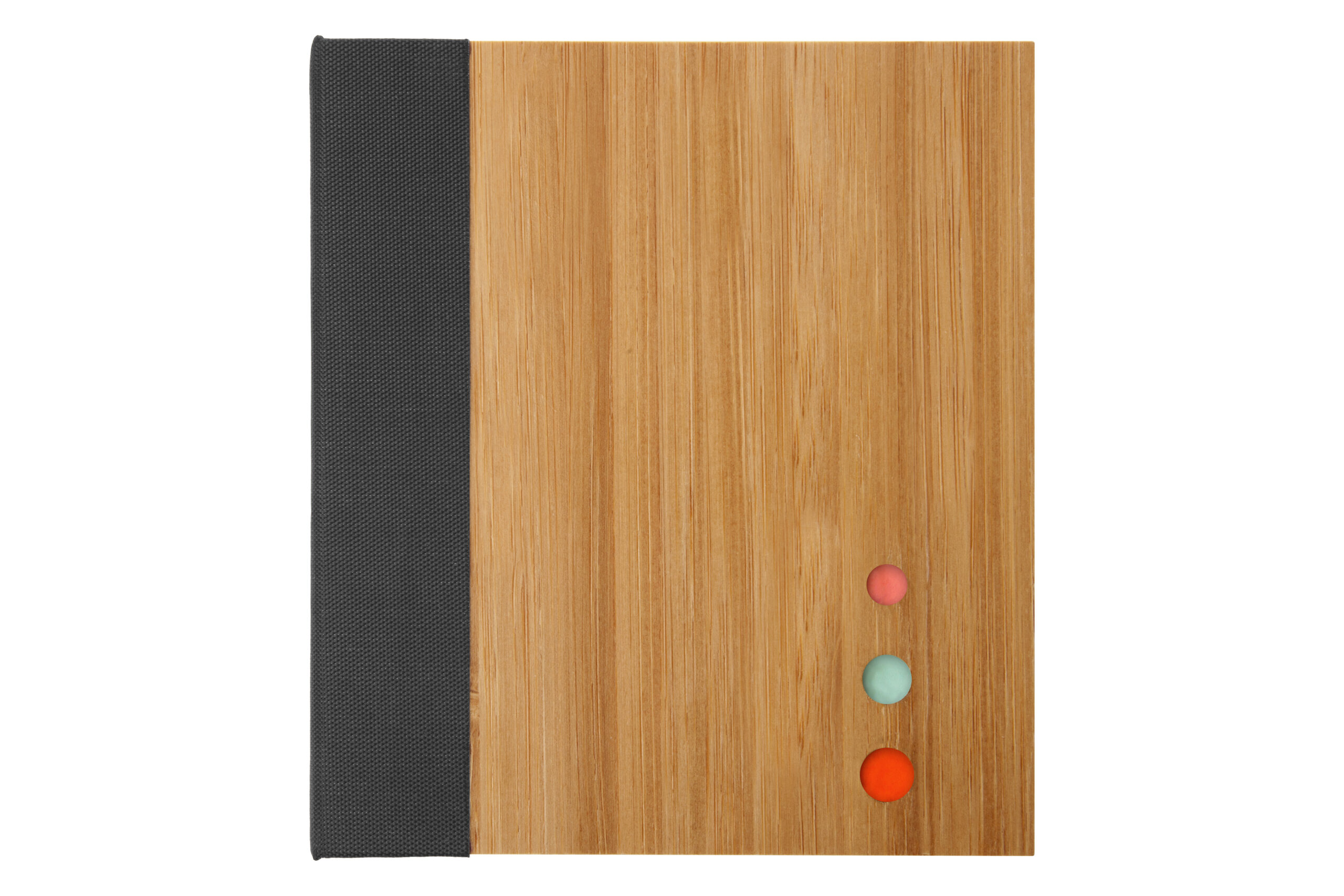 12 x 10,5 x 2 cm. Bambú. Contiene un bloc adhesivo rectangular de papel reciclado, un block adhesivo pequeño de color y 3 blocs en forma de flecha. El exterior del estuche es de bambú con detalles de tela, el interior es de plástico con divisiones. Presentación en caja de regalo.