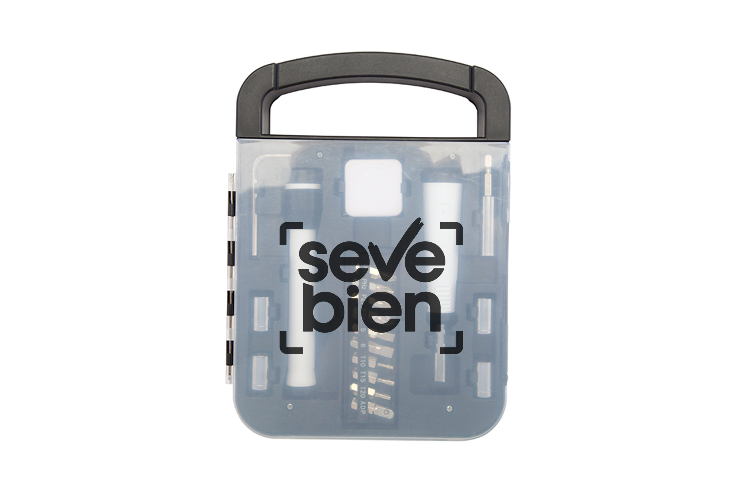 22 x 16 x 2,5 cm. Plástico. Set de herramientas de 19 piezas. Contiene: linterna, cinta metrica, multi desarmador con juego de 10 puntas (4 phillips, 2 planas, 3 hexagonales y 1 adaptador para acople). Acople para llave tubo 7, 8 , 9 y 10 mm y llave allen. Presentación en caja de regalo.