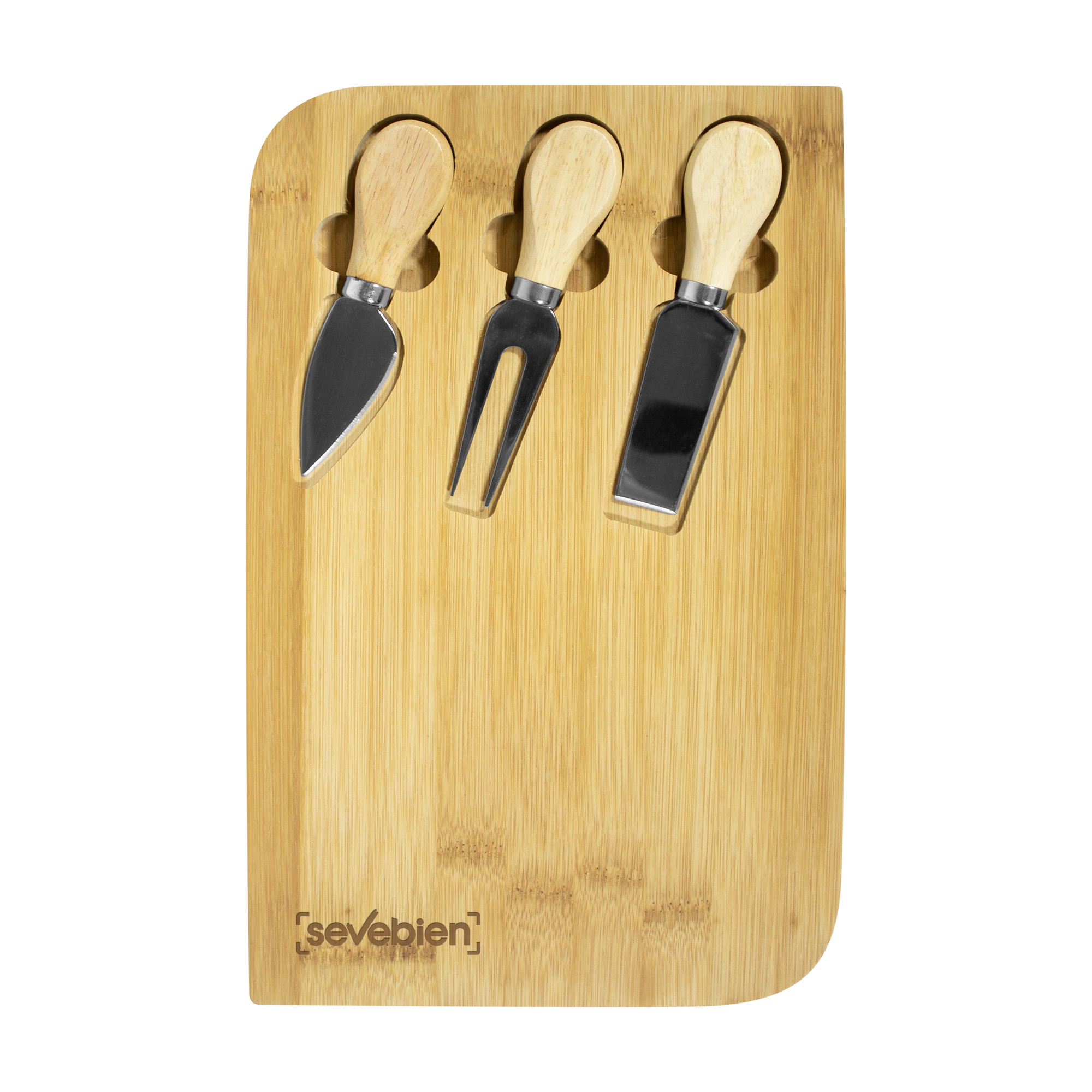 29,8 x 18,7 x 1,2 cm. Bambú y Acero inoxidable . Tabla de bambú con set de 3 utensilios de acero inoxidable 210 con mango de madera: 2 cuchillos y 1 tenedor. Tabla para cortar y presentar diferentes quesos acompañada de un buen vino tinto en tus próximas reuniones. Presentación en caja de regalo.