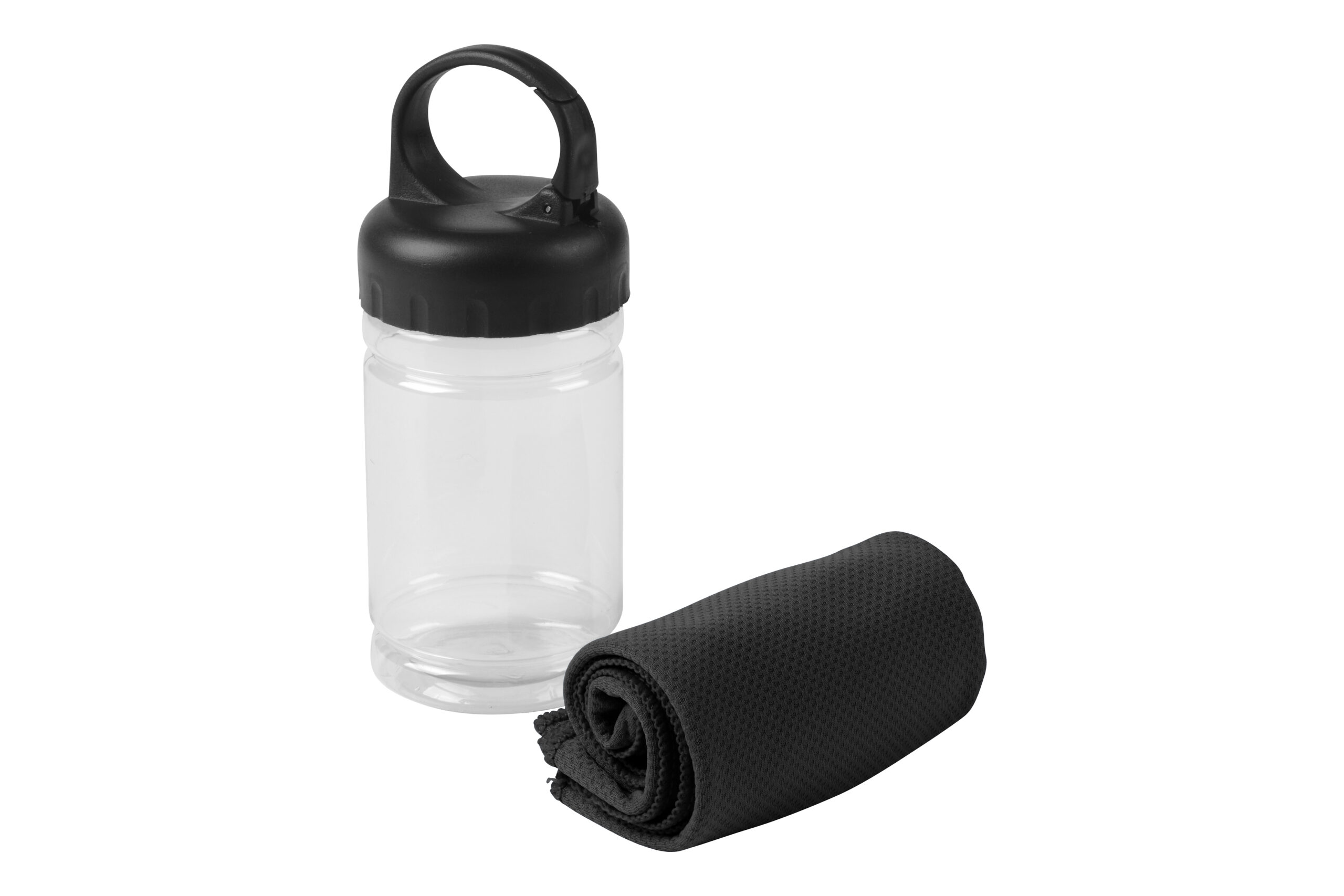 Medidas toalla 79 x 29 cm / Medidas frasco: Ø6,5 x 17 cm. Políester. Toalla de enfriamiento en un estuche de plástico transparente. Para un efecto refrescante humedezca la toalla con agua o agregue agua en el cilindro e incorpore la toalla. Tapa a rosca con mosquetón.